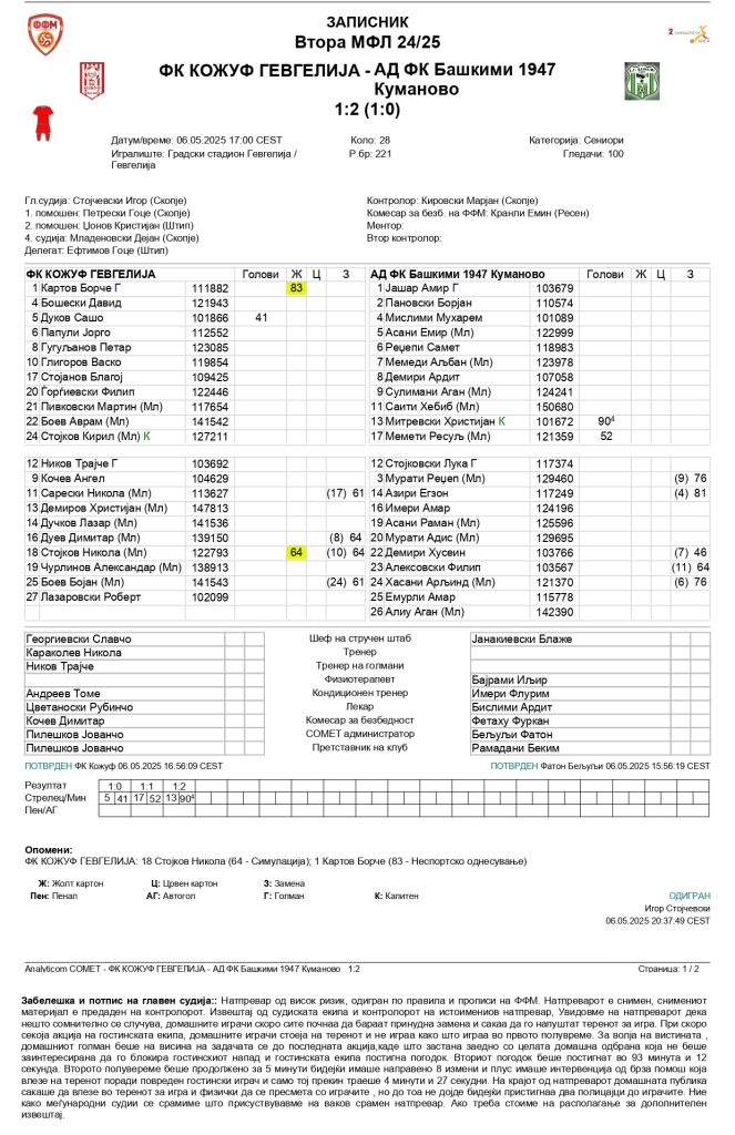 Како што е наведено во официјалниот извештај на официјалниот записник од натпреварот меѓу Кожуф и Башкими, домашните играчи барале прунудна замена и сакале да го напуштат теренот за игра. Дополнително, како што стои во официјалниот извештај, целата домашна одбрана не била заинтересирана да го блокира гостинскиот напад со што гостинската екипа постигнала погодок.