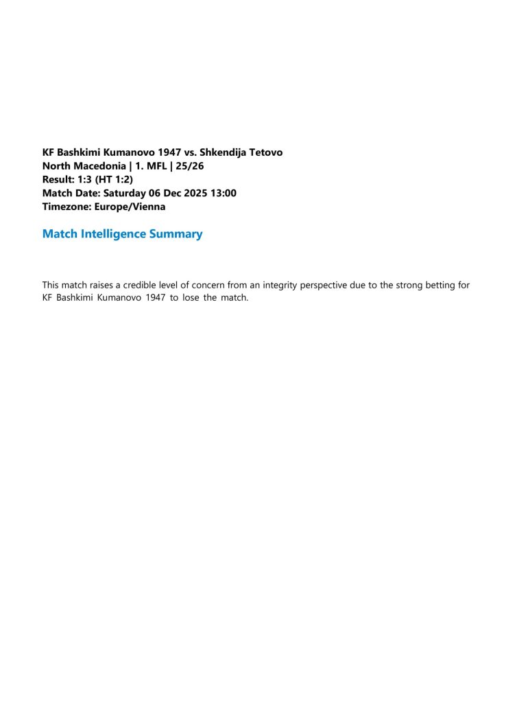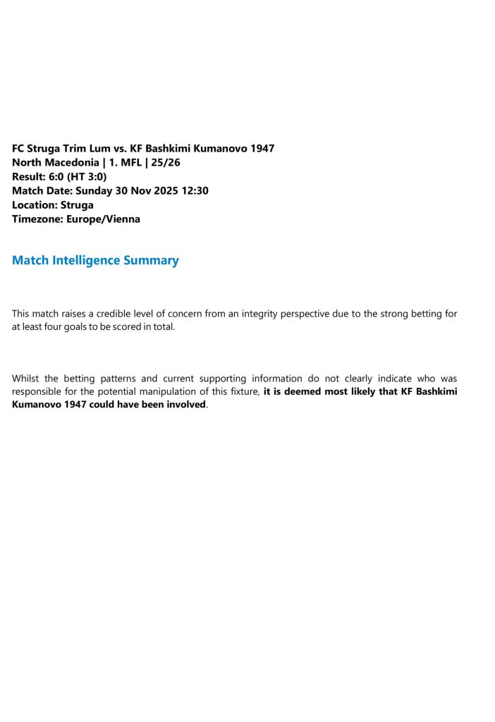 “Во моментов постојат индиции и за уште неколку натпревари, меѓу нив и мечот ФК Башкими – ФК Вардар Неготино од Втора МФЛ од сезоната 2025 одигран на 24. март, но поради чувствителноста на процесот и во интерес на истрагата, дополнителни информации ќе бидат споделени со јавноста кога предметите ќе бидат во понапредна фаза.”