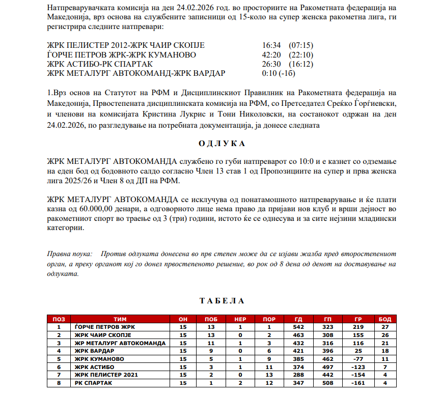 ЖРК Металург Автокоманда и официјално е исклучен од понатамошното натпреварување во Супер женската лига, по одлука на дисциплинските органи на Ракометна федерација на Македонија.
